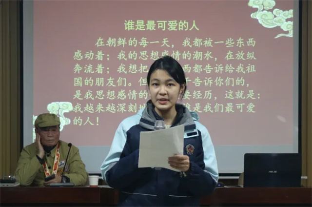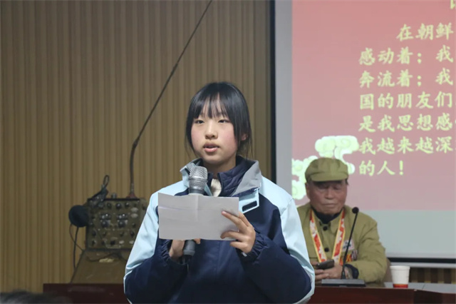 “彭爷爷的讲述让我仿佛看到了战士们冒着枪林弹雨冲锋陷阵的身影,听到了他们保家卫国的铮铮誓言,感受到了他们视死如归的革命精神。他们,是当之无愧的最可爱的人。在新的时代,我们更应传承这份精神,让红色基因在我们心中生根发芽,让英雄精神在我们手中薪火相传。”