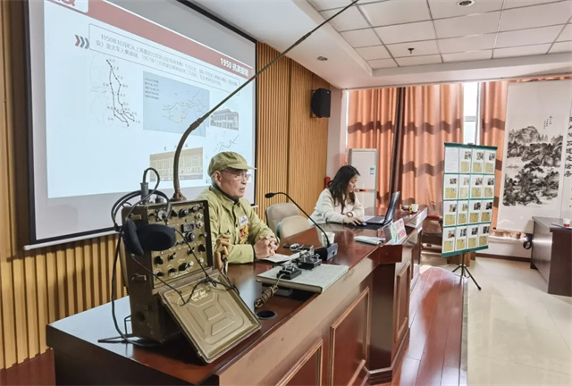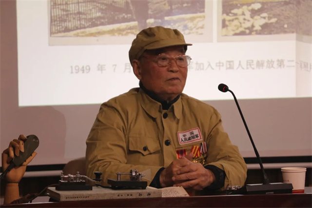 彭自强爷爷,1934年出生,15岁便毅然投身军旅,16岁奔赴抗美援朝战场,将青春的热血与忠诚奉献给伟大的祖国。彭爷爷的讲述,如同一把钥匙,开启了通往历史深处的大门,让在场的每一个人仿佛置身于那个战火纷飞的年代。彭爷爷在战场上担任司令部报务员,亲历了抗美援朝的二次战役、五次战役以及华川阻击战,战功赫赫。他动情地回忆起在战场上突发高烧至40度,却依然坚持与部队同进退、共生死的经历。这种不畏艰难、无私奉献的精神,深深感染了在场的每一位师生。“少年负壮气,奋烈自有时。”彭爷爷用他的亲身经历诠释了热血青年的担当与使命,让在场的同学们深刻体会到,青春的热血不仅属于当下,更属于那些为国家、为民族奉献一切的英雄们。