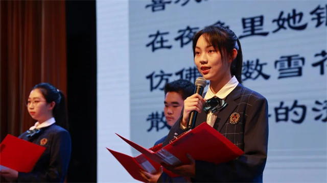 主持人方丹琼和饶满林老师深情而优雅地朗诵了《为梦想而活》,这是一个由真实故事凝结而成的作品,一位失去孩子的母亲,在诗意中与孩子一起追逐梦想和希望,一起走过山川河岳,一起看那鹤排晴秋……那汇聚着点点滴滴的爱,尽管看起来简单平常,却如夏日细雨、冬日暖阳,给人温暖和力量。同学们以持久而热烈的掌声,为“朗读者”画上了句号。